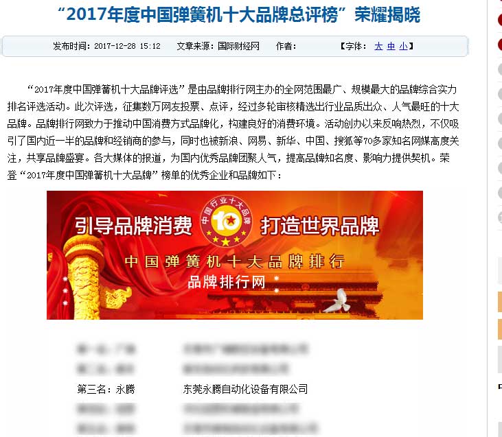 “2017年度中國彈簧機十大品牌評選”是由品牌排行網(wǎng)主辦的全網(wǎng)范圍最廣、規(guī)模最大的品牌綜合實力排名評選活動。此次評選,征集數(shù)萬網(wǎng)友投票、點評,經(jīng)過多輪審核精選出行業(yè)品質(zhì)出眾、人氣最旺的十大品牌。品牌排行網(wǎng)致力于推動中國消費方式品牌化,構(gòu)建良好的消費環(huán)境?;顒觿?chuàng)辦以來反響熱烈,不僅吸引了國內(nèi)近一半的品牌和經(jīng)銷商的參與,同時也被新浪、網(wǎng)易、新華、中國、搜狐等70多家知名網(wǎng)媒高度關(guān)注,共享品牌盛宴。各大媒體的報道,為國內(nèi)優(yōu)秀品牌團(tuán)聚人氣,提高品牌知名度、影響力提供契機。