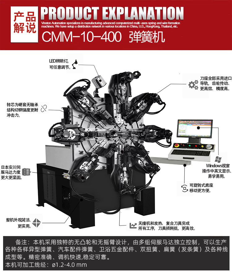 本機(jī)型適用于生產(chǎn)汽車、摩托車、自行車等車輛及娛樂健身器材所需的高精密彈簧的生產(chǎn)。