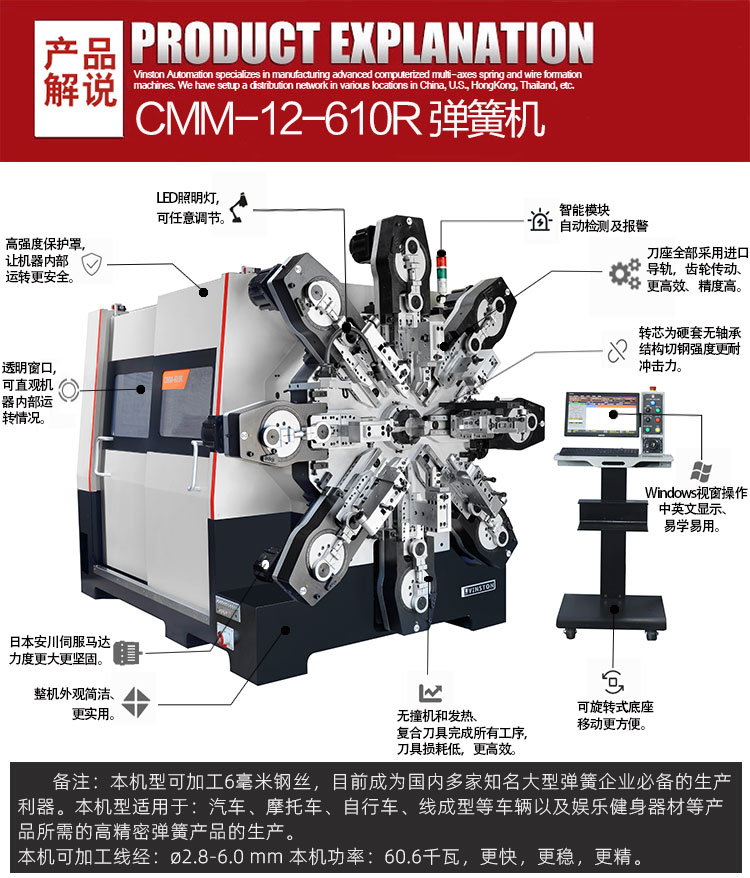 2、擁有傳統(tǒng)8工位機械之優(yōu)點、并兼?zhèn)?組自由手,可以上下、左右、自由發(fā)揮(生產(chǎn)高難度的彈簧、更容易、更快捷、更精確)。
