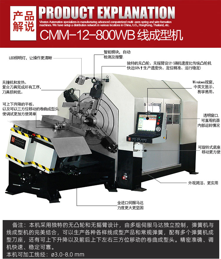 • 產(chǎn)品概述: CMM-12-800WB線材成型機(jī)可生產(chǎn)?3.0-8.0 mm線經(jīng)線成型)本機(jī)采用獨(dú)特的無凸輪和無搖臂設(shè)計(jì),由多組伺服馬達(dá)獨(dú)立控制,彈簧機(jī)與線成型機(jī)的完美結(jié)合,可以生產(chǎn)各種各樣線成型產(chǎn)品和常規(guī)彈簧,配有多個(gè)彈簧機(jī)成型刀座,還有可上下升降以及前后上下左右三方位移動的卷曲成型頭。精密準(zhǔn)確、調(diào)機(jī)快速、穩(wěn)定可靠。