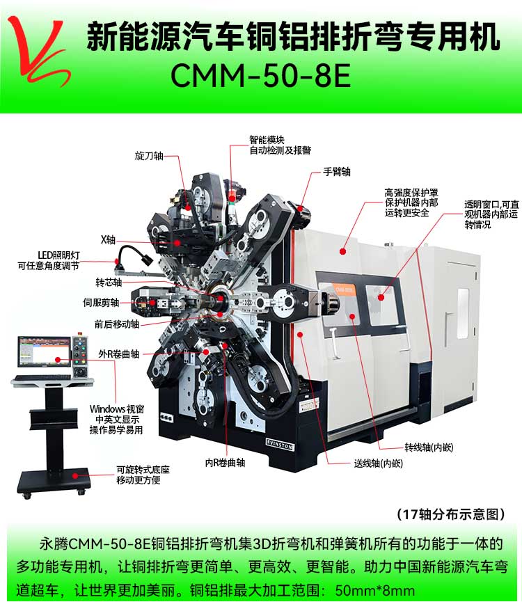 • 產(chǎn)品概述: CMM-50-8E銅排折彎機(最大通過尺寸:50mm*8.0mm)集3D折彎機和彈簧機所有的功能于一體的多功能專用機,本機采用獨特的無凸輪和無搖臂設(shè)計,由多組伺服馬達獨立控制,永騰銅排折彎機廣泛應(yīng)用于導(dǎo)電排成型,新能源電池連接排、新能源電池模組、銅母排成型、硬排成型、導(dǎo)電排、電池連接排、銅排、裸排成型等。精密準確、調(diào)機快速、穩(wěn)定可靠。